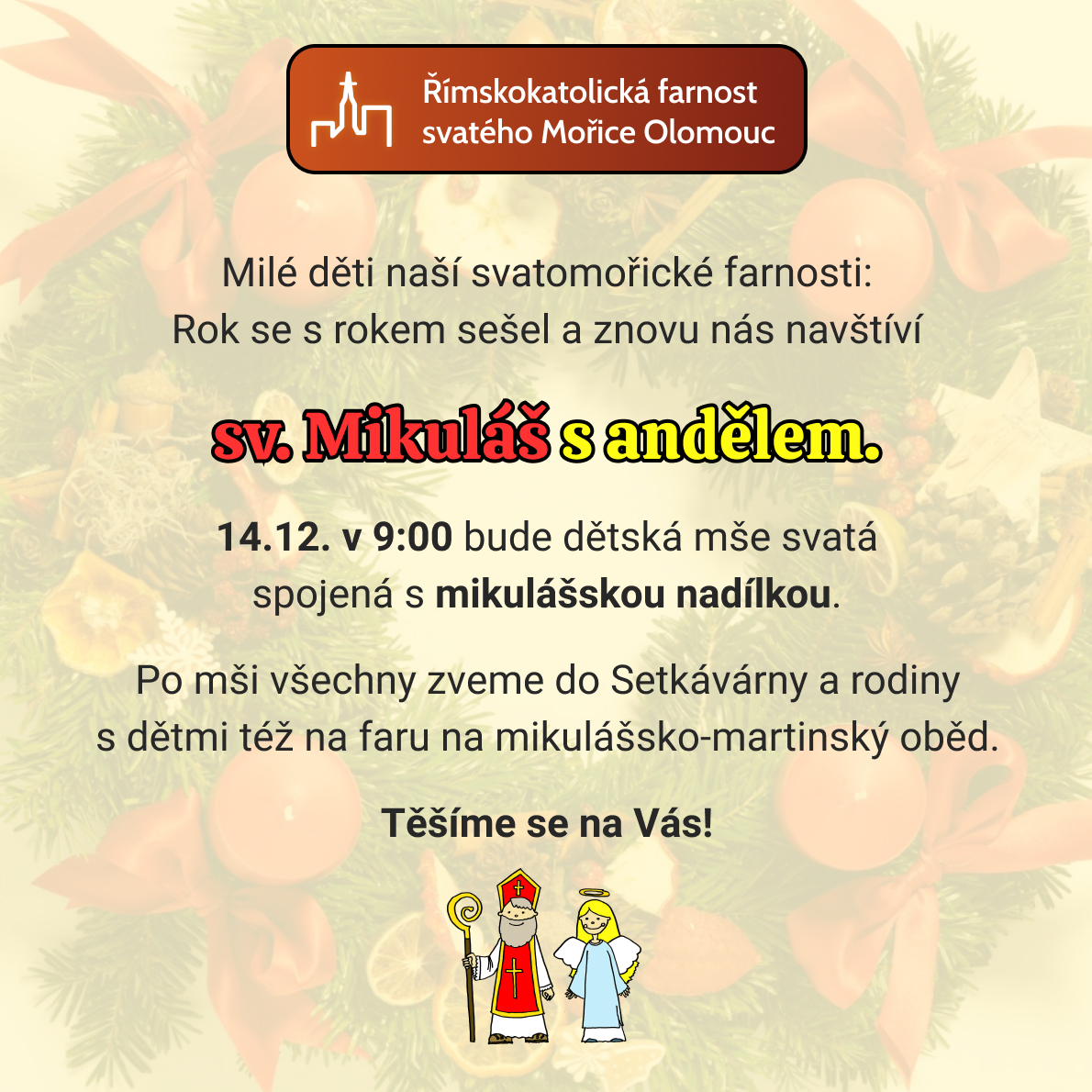 | 9:00 | MŠE SVATÁ (program pro děti, Mikuláš), po mši Setkávárna |